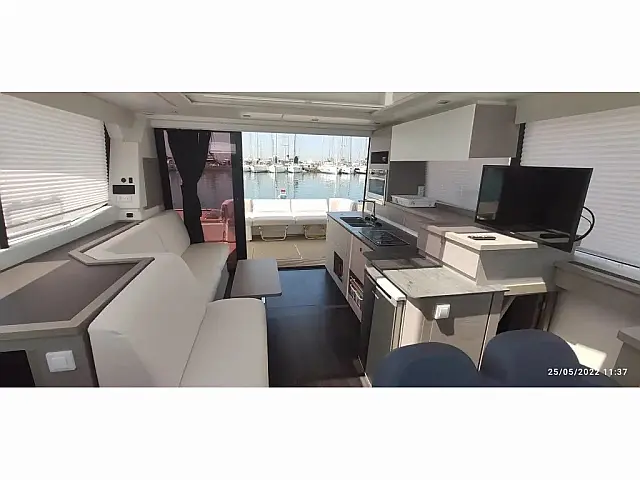 Klimaanlage, Grill im Cockpit, Beiboot, Elektrische Toilette, Elektrische Winch (Segel), Kaffeemaschine, Generator, Außenbordmotor, Solar-Panele, Wassermacher Autopilot, Kartenplotter im Cockpit Stand up paddle, TV
