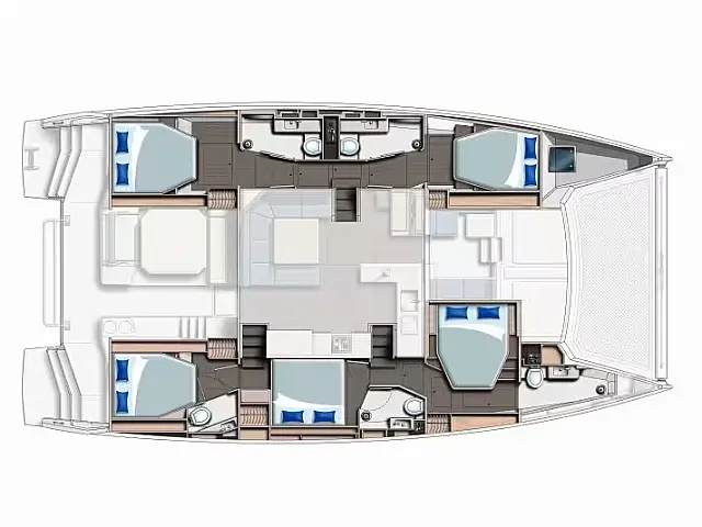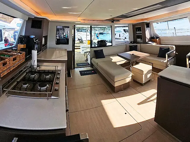 Cockpit-Kissen, Flybridge, Eismaschine, Elektrische Winch (Segel), Badeplattform, Bimini, Tenderlift-Plattform, Beiboot, Grill im Cockpit, Teak Cockpit, Kaffeemaschine, Geschirrspüler, Kühlschrank, Elektrische Toilette, Waschtrockner, Klimaanlage, Generator, Heizung, Inverter, Solar-Panele, Wassermacher, Wi-Fi und Internet Lazy bag Autopilot, Kartenplotter, Radar Radio-CD Player, Schnorchelausrüstung, Stand up paddle, TV Unterwasserleuchten