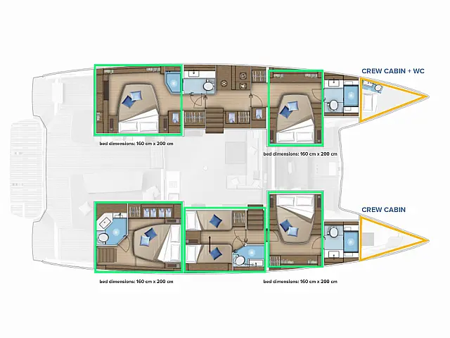 Teak Cockpit, Barbecue grill in cockpit, Teak deck, Air condition, Refrigerator, Generator, Inverter, Water maker, Dinghy, Coffee maker, Dishwasher, Ice maker, Wi-Fi & Internet, Cockpit speakers Bow thruster, Autopilot Stand up paddle, Snorkeling equipment, Radio-CD player, TV
