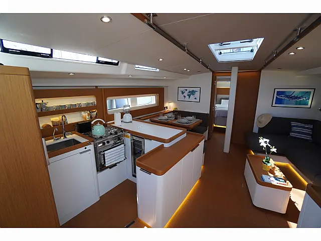 Teak Cockpit, Badeplattform, Cockpit-Kissen, Teakdeck, Klimaanlage, Generator, Inverter, Heizung, Kaffeemaschine, Geschirrspüler, Sprayhood, Bimini, Wi-Fi und Internet, Lautsprecher im Cockpit Autopilot, Kartenplotter im Cockpit, Radar Lazy jack Stand up paddle