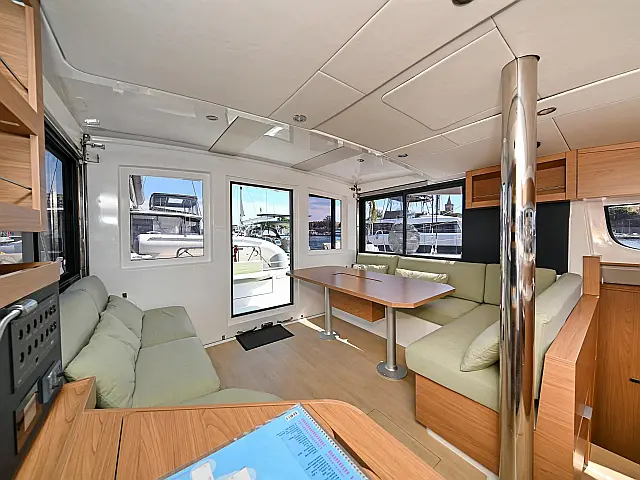 Cockpit-Kissen, Solar-Panele, Wassermacher, Badeplattform, Bimini, Beiboot, Sprayhood, Kühlschrank, Elektrische Toilette, Lautsprecher im Cockpit Lazy bag, Lazy jack Autopilot, Kartenplotter, Kartenplotter im Cockpit