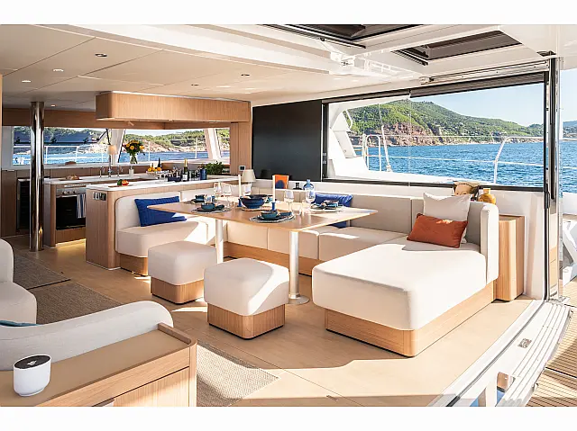 Inverter, Refrigerator, Cockpit cushions, Electric toilet, Water maker, Ice maker, Solar Panels, Cockpit speakers, Air condition, Electric winches, Teak deck Chart plotter, Autopilot TV, Snorkeling equipment Lazy bag, Lazy jack
