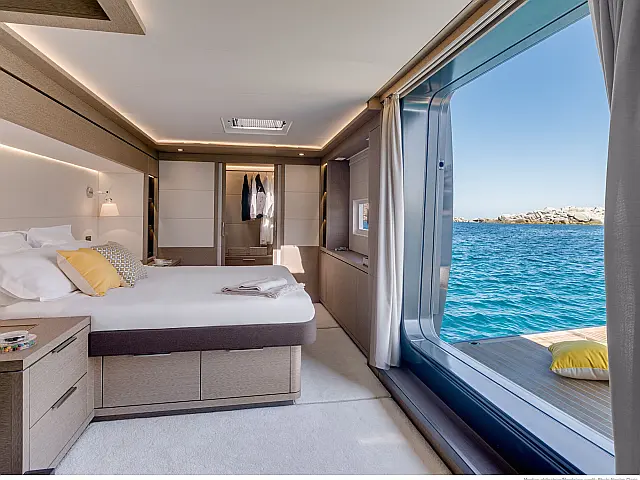 Klima, Hladnjak, Desalinizator, Bimini, Zvučnici u kokpitu, Pomoćni čamac, Vanbrodski motor, Flybridge, Paluba od tikovine, Inverter Radio-CD player Autopilot, Ploter karata, Radar Lazy jack, Lazy bag