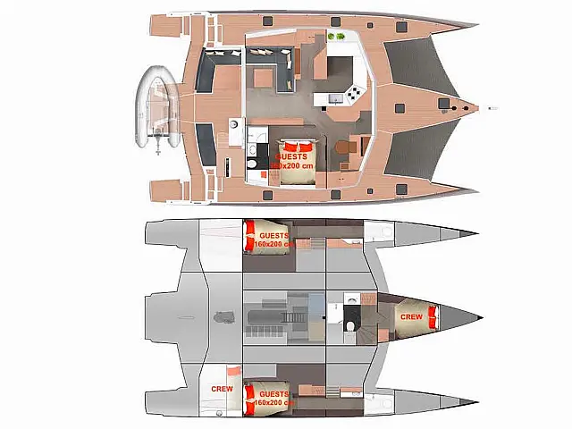 Bimini, Roštilj u kokpitu, Desalinizator, Inverter, Pomoćni čamac, Crni tank, Solarni paneli, Električni WC, Klima, Generator Stand up paddle, Oprema za ronjenje na dah, Radio-CD player, TV